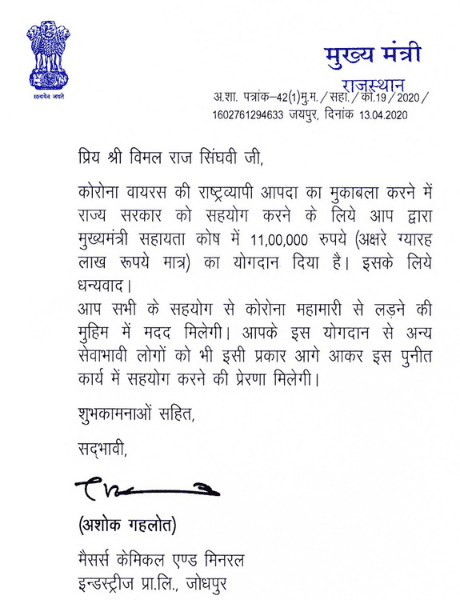Financial contribution of ₹11,00,000 to the Rajasthan Chief Minister Relief Fund